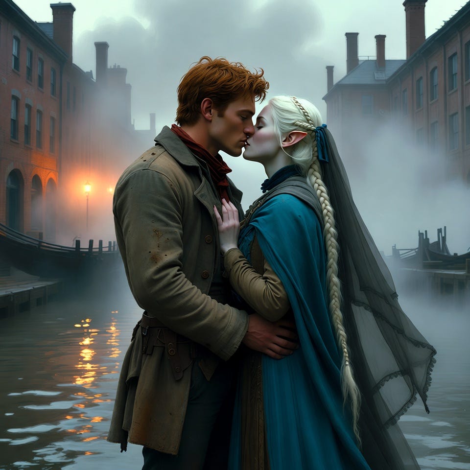 The world narrowed to breath and warmth, to the faint taste of honey and almonds, to the impossible gentleness of her hands against his shoulders. Her veil slipped aside, caught in the wind, forgotten. The city sounds fell away until there was only the lap of the river and the low hum of lantern light.
